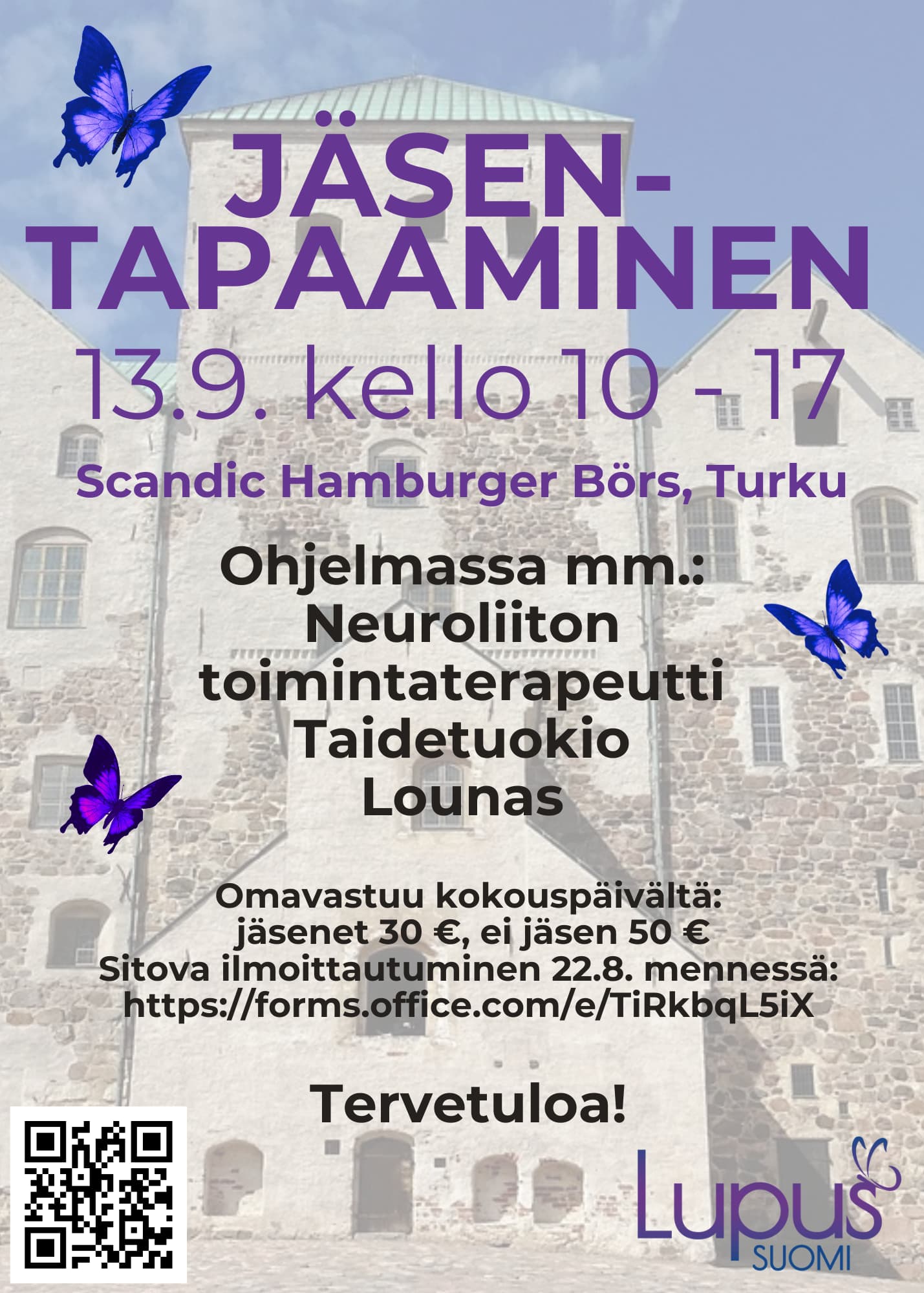 - Osallistumismaksu jäseniltä 30 €, muilta 50 €. Maksu sisältää kokouspäivän, lounaan, kahvit sekä Minna Terentjeffin virkkaaman perhosen.